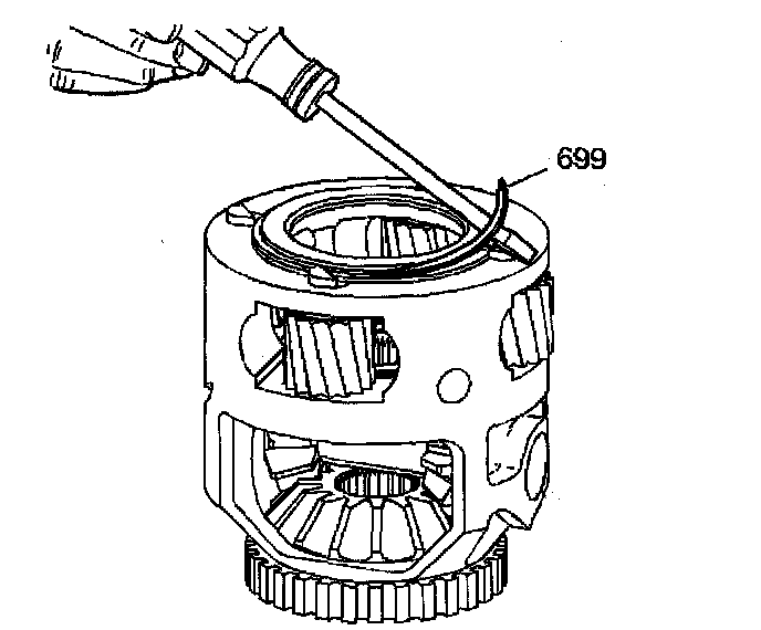 1. Use a screwdriver in order to remove the snap ring (699) from the front differential carrier.