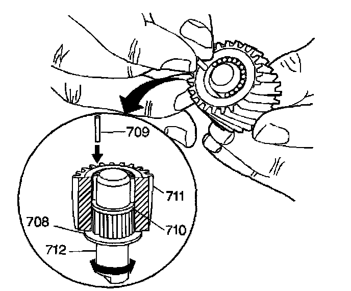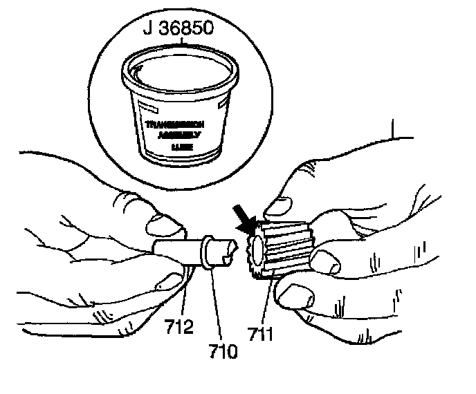 13. Affix two pinion gear thrust washers (708) on each side of the pinion gear (711). Apply J 36850 or equivalent.