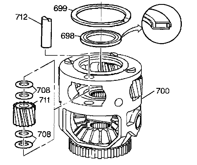 2. Install the side gears (705) with the thrust washers into the differential carrier housing (700).