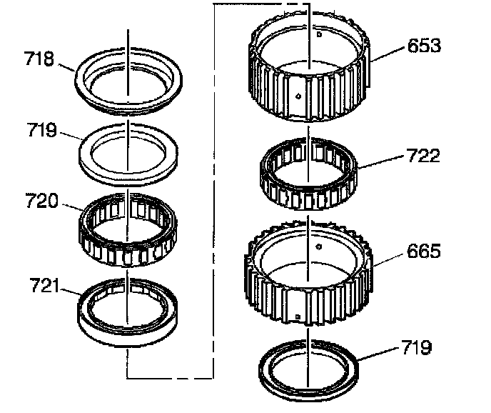 7. Remove the 3rd clutch and input clutch sprag assemblies (720, 722) from the sprag outer races (653, 665).