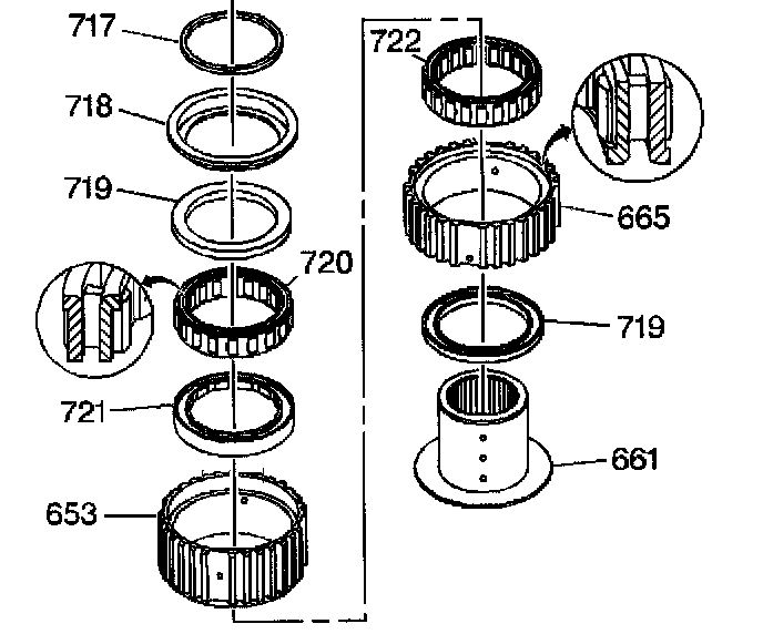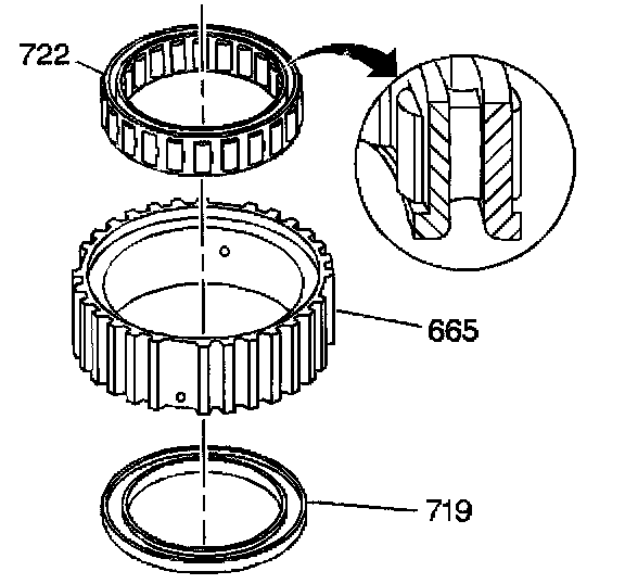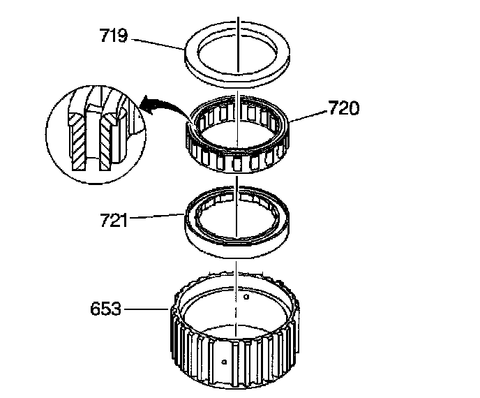^ Be sure that you seat the spiral lock retaining ring (717) in the groove on the input and third clutch sprag inner race. The tabs and the slots on the spiral lock retaining ring (717) must lock.