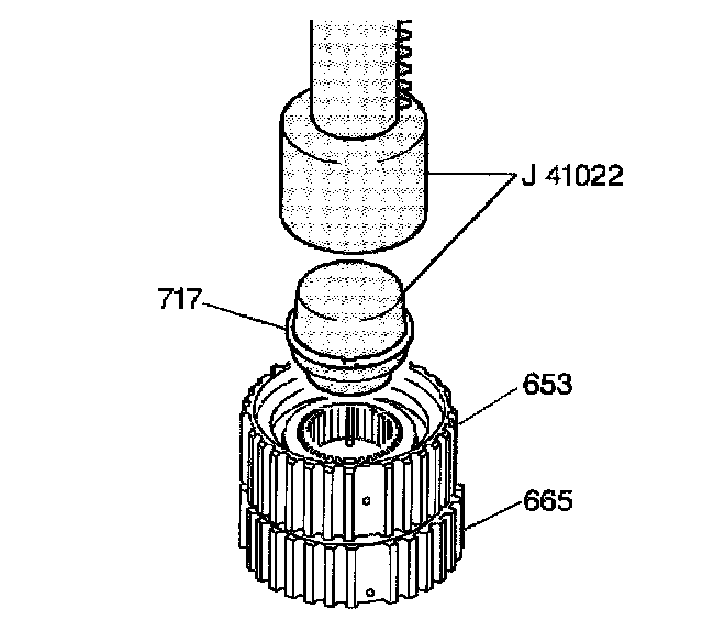 17. Attach J 41022 to an arbor press. Use this tool combination and a small flat blade screwdriver in order to install the spiral lock retaining ring (717) onto the input and third clutch sprag inner race.