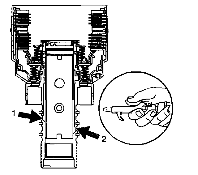 Important: Air pressure that exceeds recommended amounts may damage seals or cause seals to roll.1. Use a rubber tipped air nozzle in order to apply a maximum 138 kPa (20 psi) at each indicated fluid passage.