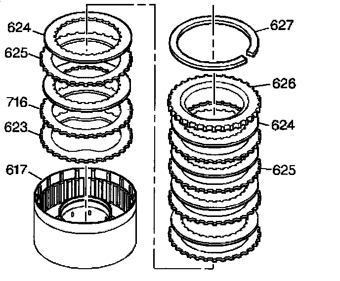 3. Remove the second clutch apply plate (716). Remove the second clutch waved plate (623).