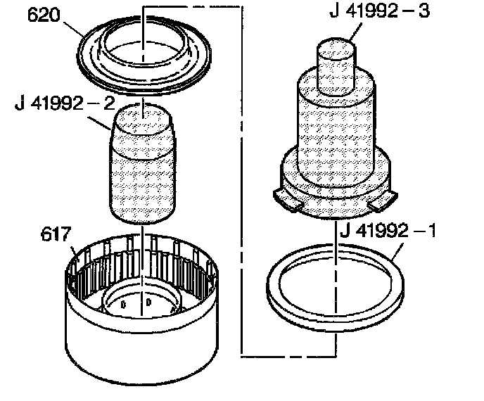 2. Install the second clutch piston (620) and J 41992-3 into J 41992-1 protector.