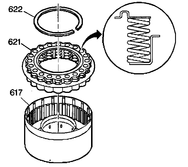 6. Assemble the second clutch spring assembly (621) into the second clutch housing assembly (617).
