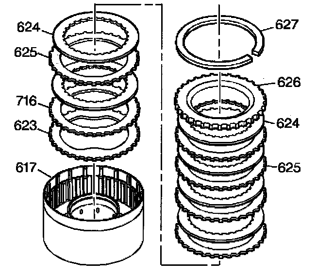 8. Install the second clutch waved plate (623) into the second clutch housing (617).