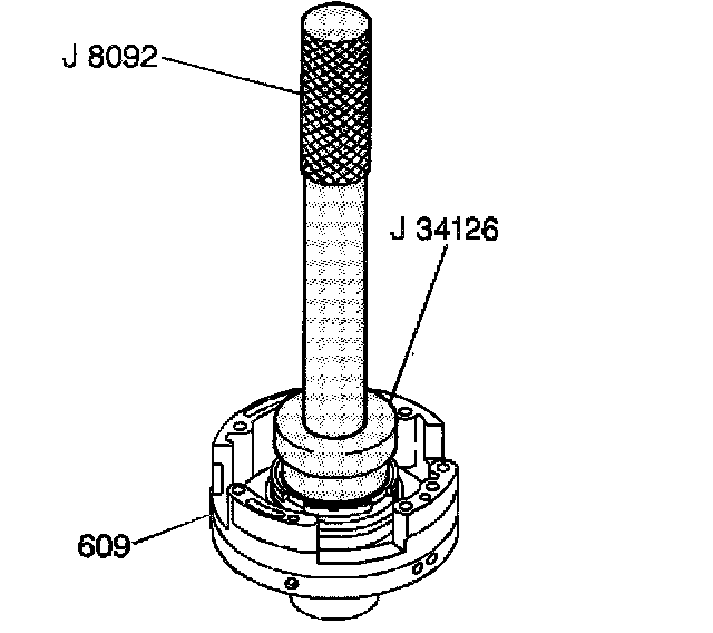 Use J 34126, J 8092 and a hammer in order to seat the driven sprocket support bearing assembly flush with or below the driven sprocket support assembly (609) hub.