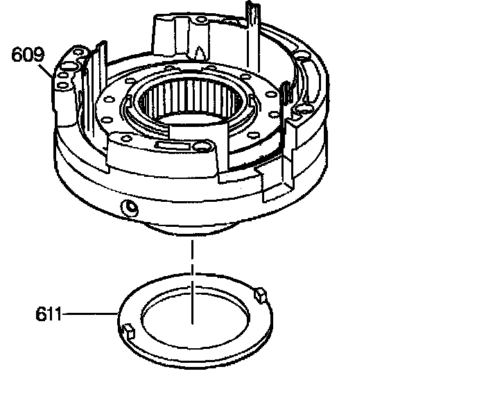 1. Use J 36850 or equivalent in order to secure the second clutch housing thrust washer (611) to the driven sprocket support assembly (609).