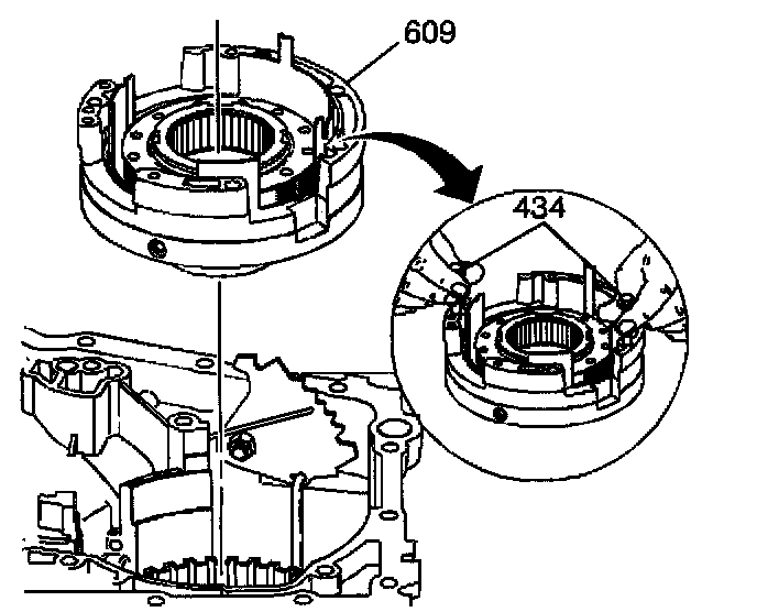 3. Using the bolts (434), lift the driven sprocket support assembly (609) into the case and align as shown. The top of the driven sprocket support assembly (609) should be flush with the case.