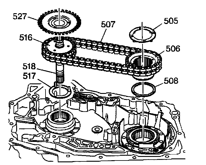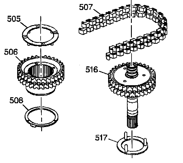 6. Install the drive link assembly (507) and the sprockets (506, 516) into the case by hand. A slight rocking motion may be required in order to work the sprockets into place.