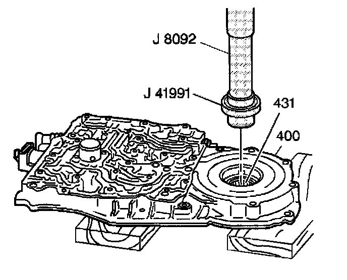 3. Use a hammer and J 8092 / J 41991 Bearing Remover/Installer. Drive out the drive shaft bearing assembly (431) from the case cover (400).