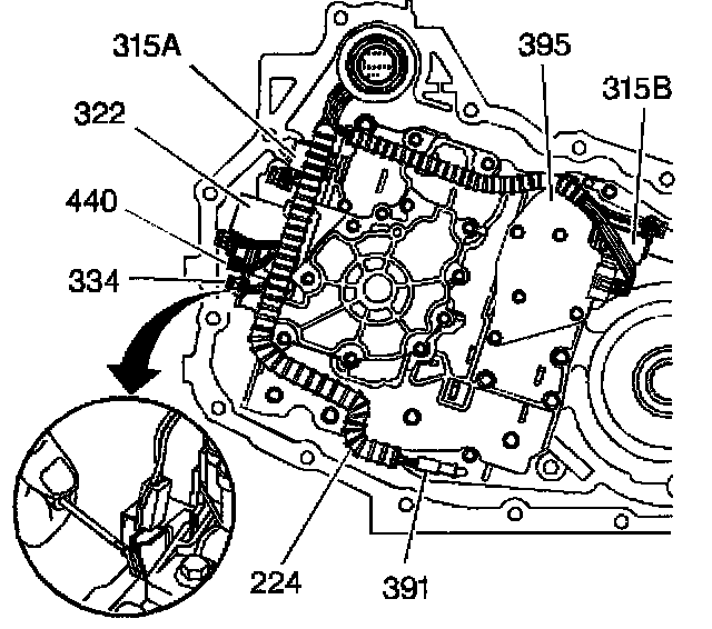 2. Use a small flat-bladed tool in order to remove the wiring harness from the solenoid valve(s) (315A, 315B, 322, 334, and/or 440), TFP manual valve position switch (395) and/or the temperature sensor (391).