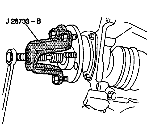 7. Separate the front wheel drive axle from the front wheel drive shaft bearing using the J 28733-B Front Hub Spindle Remover. The nut can be partially re-installed to protect the threads.