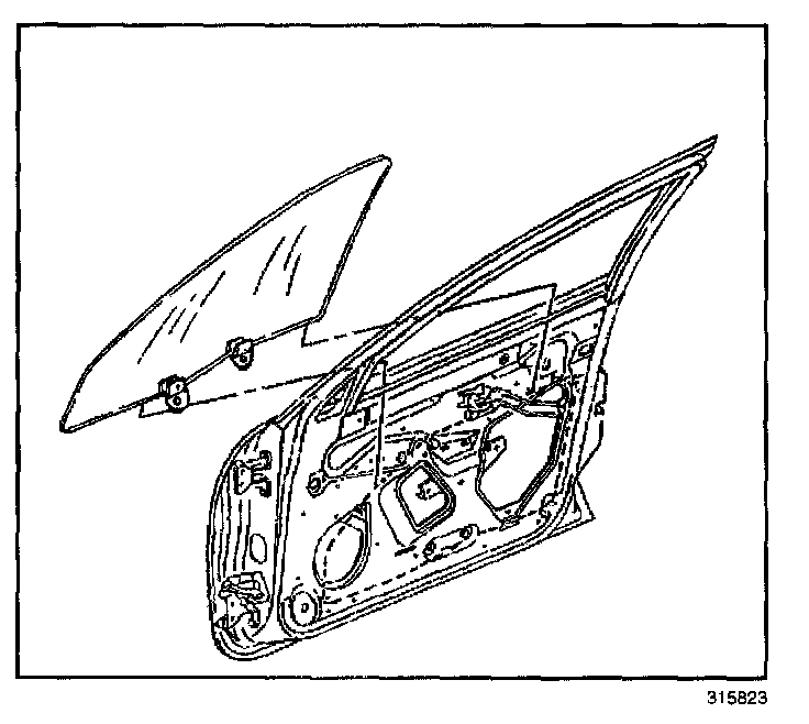 4. Turn the window to the horizontal position. Align the holes in the window with the holes in the regulator. Ensure that both sealing lips on the front door outer belt sealing strip are not rolled over and pointing downward. If this condition is present, the window will not raise correctly.