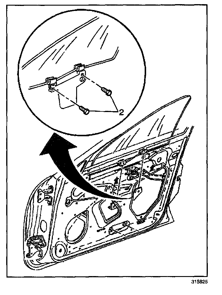 4. Remove the window to regulator bolts (2).