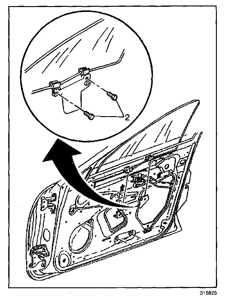 3. Raise the window far enough in order to gain access through the door inner panel to the window to regulator bolts (2).