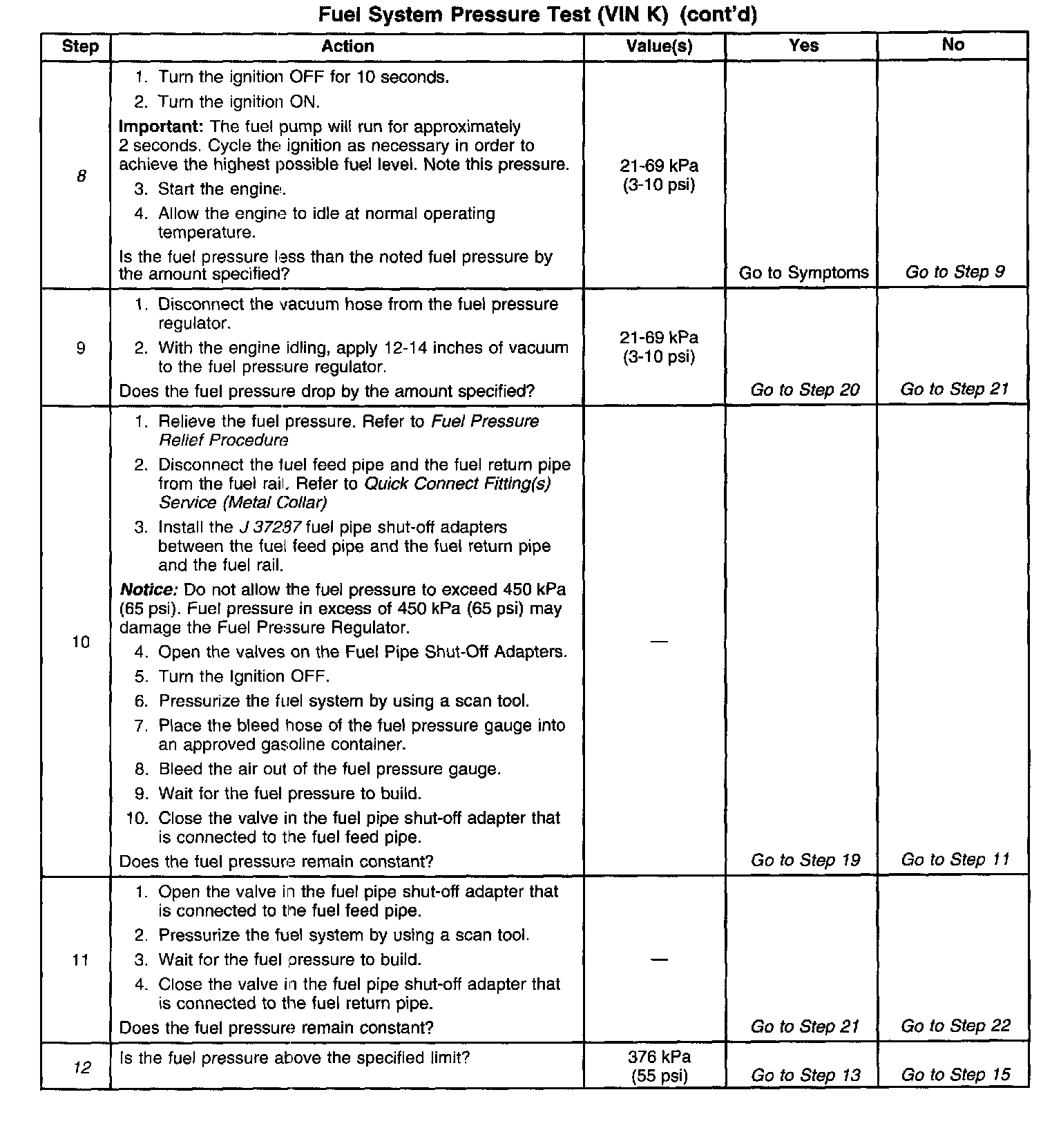 16. Restricting the fuel return pipe with the Fuel Pipe Shut-Off Adapter Refer to J 37287 causes the fuel pressure to rise above the regulated fuel pressure. Using a scan tool to pressurize the system, the fuel pressure should rise above 376 kPa (55 psi) as the valve on the Fuel Pipe Shut-Off Adapter connected to the fuel return pipe becomes partially closed.