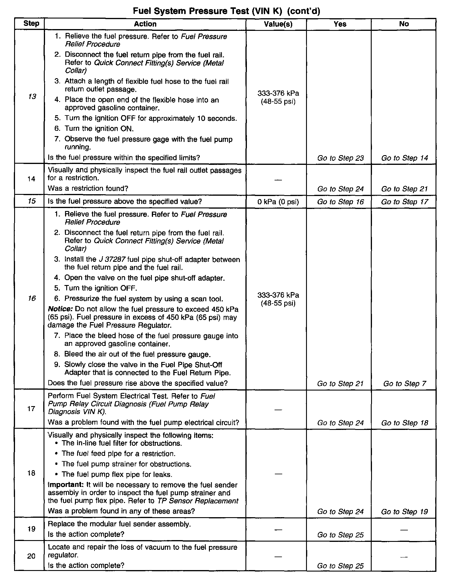 13. This test determines if the high fuel pressure is due to a restricted fuel return pipe or if the high fuel pressure is due to a faulty fuel pressure regulator.