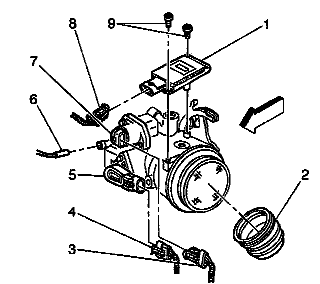 3. Remove the bolts (9) holding MAF sensor (1) to throttle body.