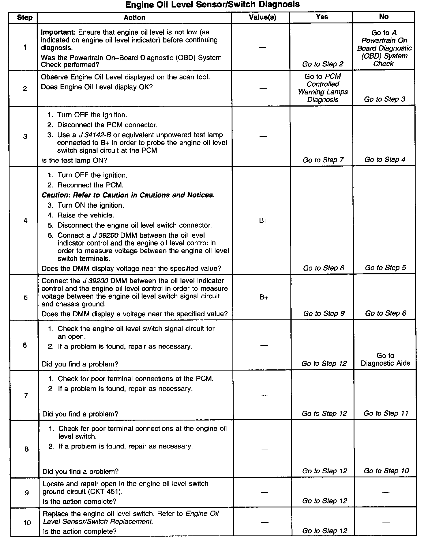If the problem with the Low Oil Level lamp cannot be isolated using the Engine Oil Level Switch Diagnostic table, refer to PCM Controlled Warning Lamps Diagnosis. Component Tests and General Diagnostics