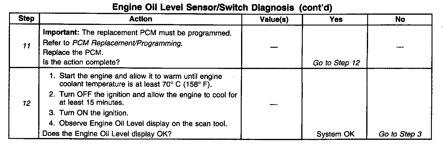 12. For the PCM to check engine oil level, start-up engine coolant temperature must be at least 12°C (22°F) cooler than the engine coolant temperature was last time the ignition was turned OFF. Allowing the engine to warm and then cool ensures that the PCM checks the engine oil level switch and that the information displayed on the scan tool is current.