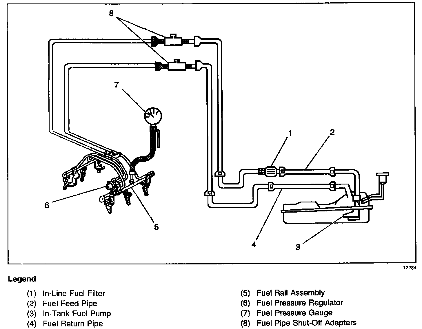 A fuel pressure regulator, attached to the Fuel Rail, keeps the fuel available to the fuel injectors at a regulated pressure. Unused fuel is returned to the fuel tank by a separate fuel return pipe. The fuel pump flex pipe functions as a conduit for transporting pressurized fuel from the fuel pump to the above cover fuel feed pipe. The fuel pump flex pipe also eliminates fuel pump generated pressure pulse noise, and eliminates clamps formerly needed for rubber hoses or nylon pipes. The fuel pressure gauge and fuel pipe shut off adapters are used for fuel system diagnosis.