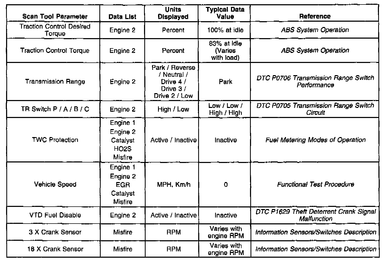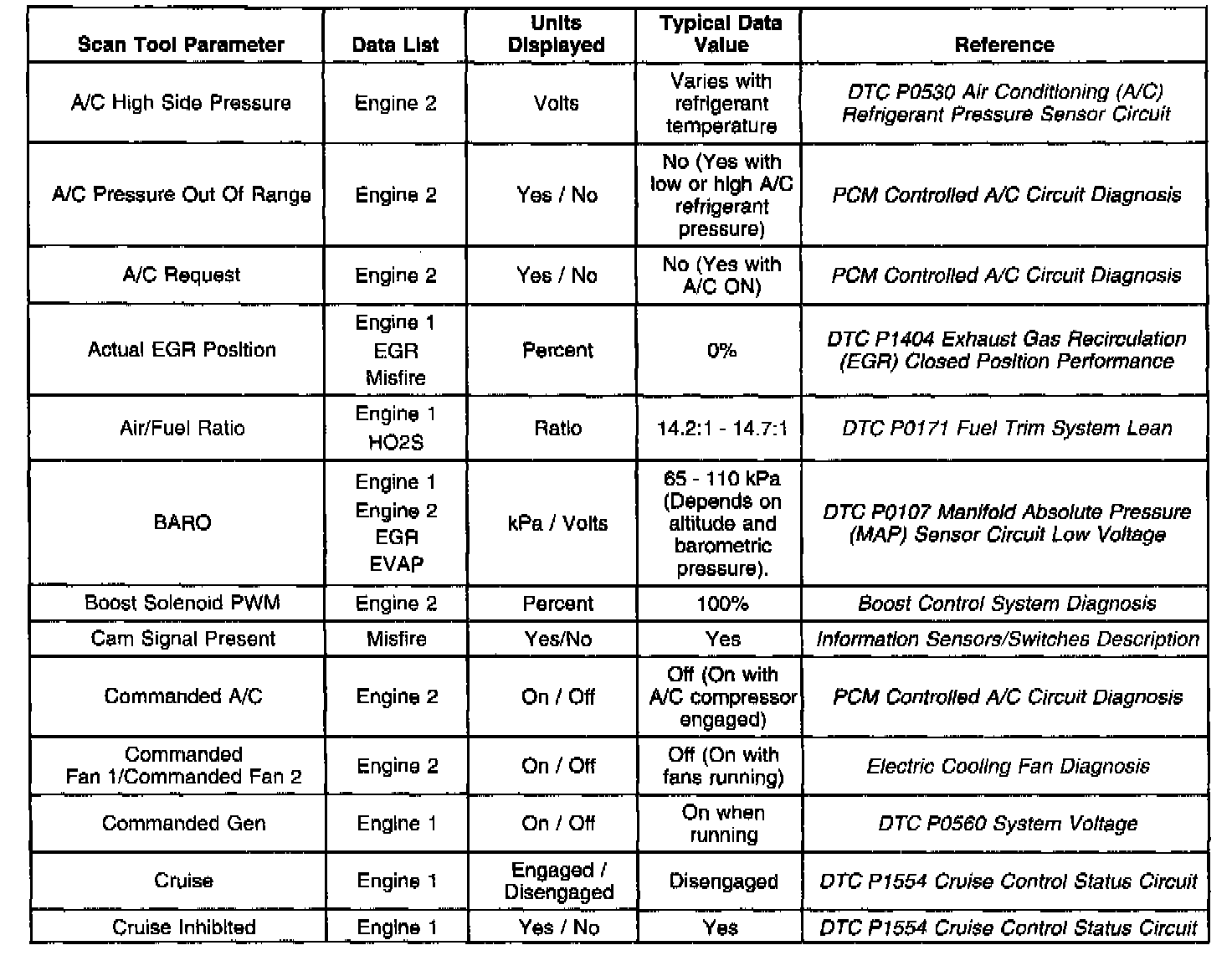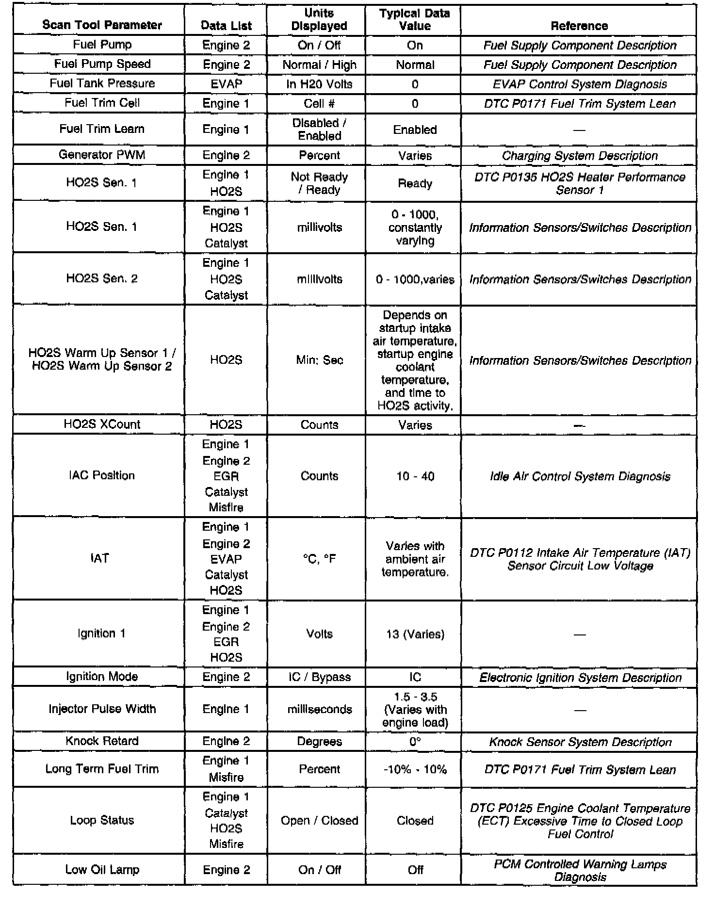 Only the parameters listed below are referred to in this service manual for use in diagnosis. For further information on using the scan tool to diagnose the PCM and related sensors, refer to the applicable reference section listed below. If all values are within the typical range described below, refer to Symptoms section for diagnosis. The Typical Scan Data Values table contains all the parameters included in the following data lists arranged in alphabetical order: