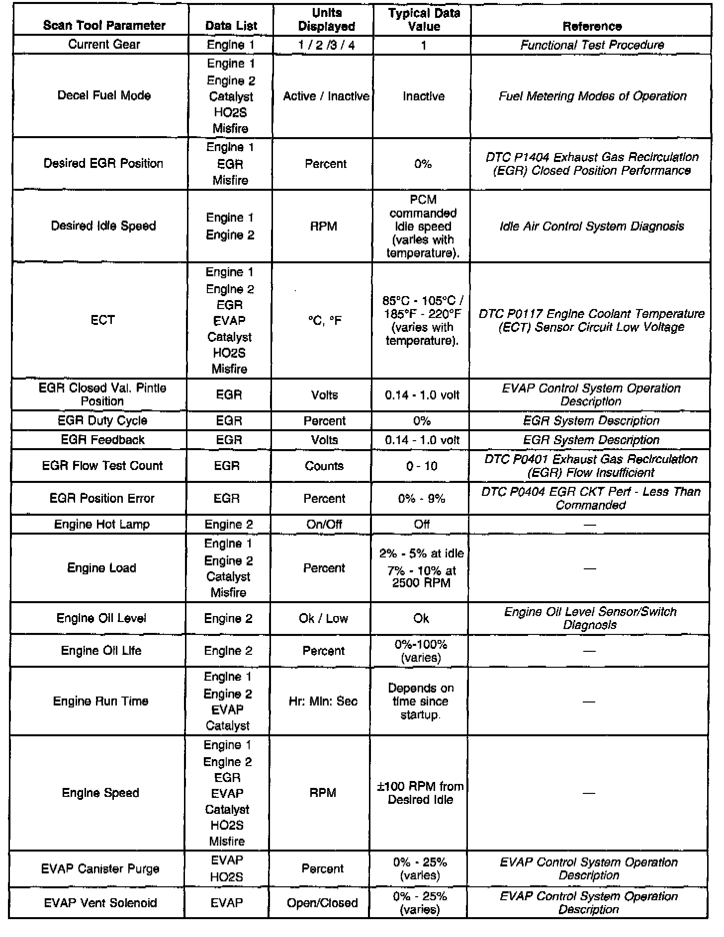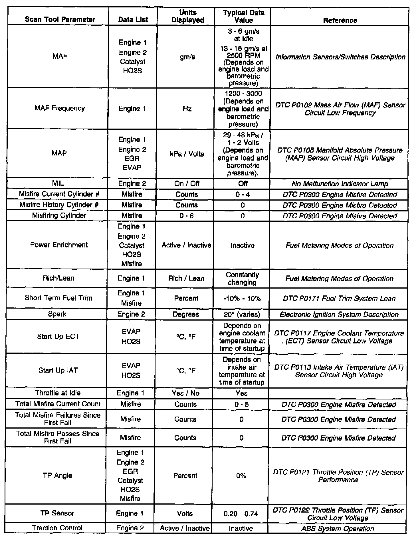 Use the Typical Scan Data Values table only after the Powertrain On-Board Diagnostic System Check has been completed, no DTC(s) were noted and you have determined the on-board diagnostics are functioning properly. Scan tool values from a properly running engine may be used for comparison with the engine you are diagnosing. The Typical Scan Data values represent values that would be seen on a normally running engine.