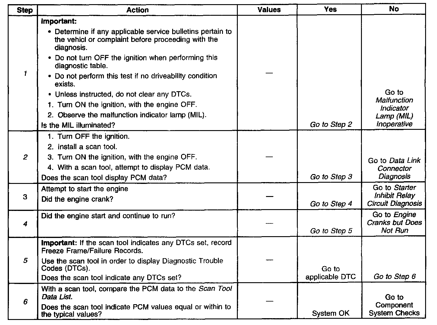 1. The MIL should be ON steady with the key ON/engine OFF. If not, the No Malfunction Indicator Lamp table should be used to isolate the malfunction.