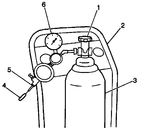 9. Disconnect the black hose (4) that connects the nitrogen cylinder to the cart J 41413 at the pressure regulator (5).