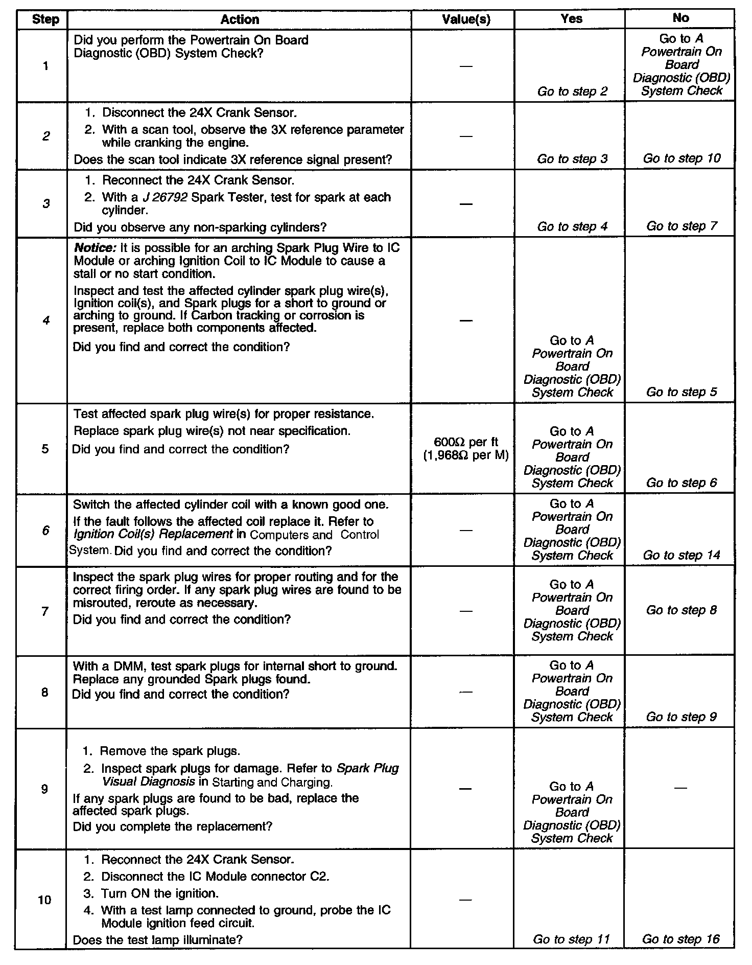 Conventional ignition coils have one end of the secondary winding connected to the engine ground. In this ignition system, neither end of the secondary winding is grounded. Instead, each end of a coil's secondary winding is attached to a spark plug. Each cylinder is paired with the cylinder that is opposite it (1, 2-5, 3-6). These two plugs are on companion cylinders, i.e., on top dead center at the same time. When the coil discharges, both plugs fire at the same time to complete the series circuit. The cylinder on compression is said to be the event cylinder and the one on exhaust is the waste cylinder. The cylinder on the exhaust stroke requires very little of the available energy to fire the spark plug. The remaining energy will be used as required by the cylinder on the compression stroke. The same process is repeated when the cylinders reverse roles. This method of ignition is called a waste spark ignition system. This table assumes there are no Ignition System, Fuel Injector, Cam Sensor, or Crank Sensor DTC's present. The Electronic Ignition System Check tests for faulty ignition coils, spark plugs, plug wires, the 7X Crank Sensor, and IC Module. This table requires the J 26792 Spark Tester.