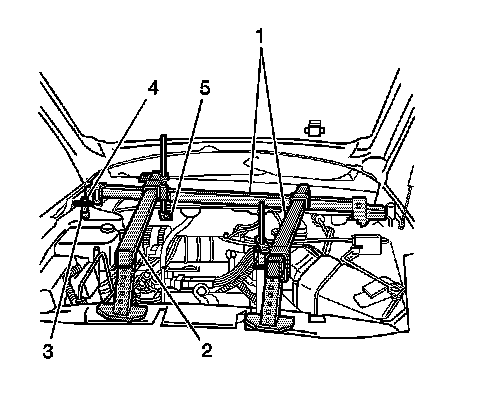 15. Remove the engine frame insulator fasteners (3) retaining the engine frame (2) to the vehicle.