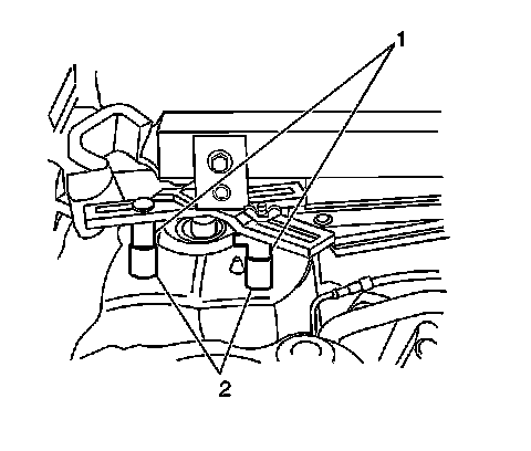 2. Using dowel pins in the alignment holes (1), align the engine frame (2) with the vehicle.