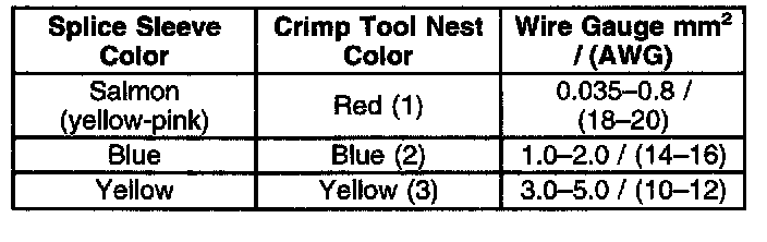 4. Select the proper sealed splice sleeve according to the wire size. Refer to the above table at the beginning of the repair procedure for the color coding of the splice sleeves and the crimp tool nests.
