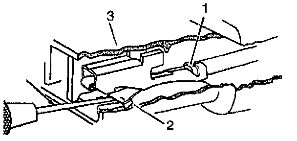 4. Grasp the wire at the back of the connector body and gently pull the terminal (1) from the connector body (3).