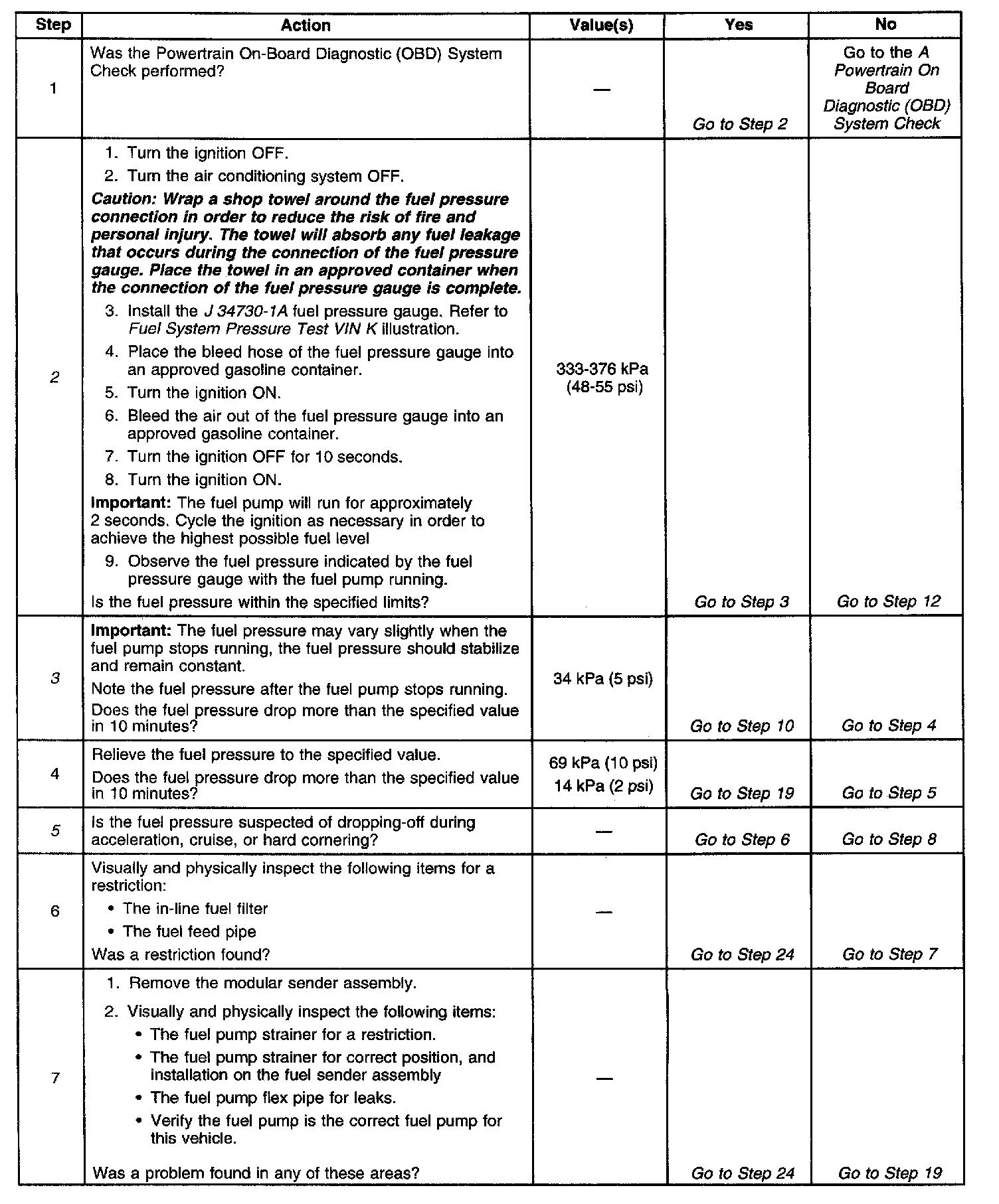 15. A lean condition may result from the fuel pressure being below 333 kPa (48 psi). A lean condition may cause a DTC P0131 or a DTC P0171 to set. Driveability conditions associated with lean conditions can include hard starting (when the engine is cold), hesitation, poor driveability, lack of power, surging, and misfiring.