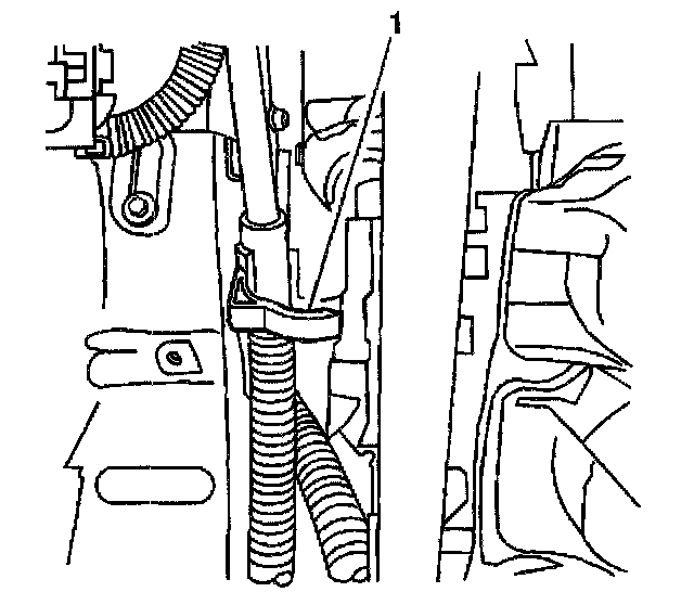 5. Disconnect the A/C hose retaining clip (1) at the rail.