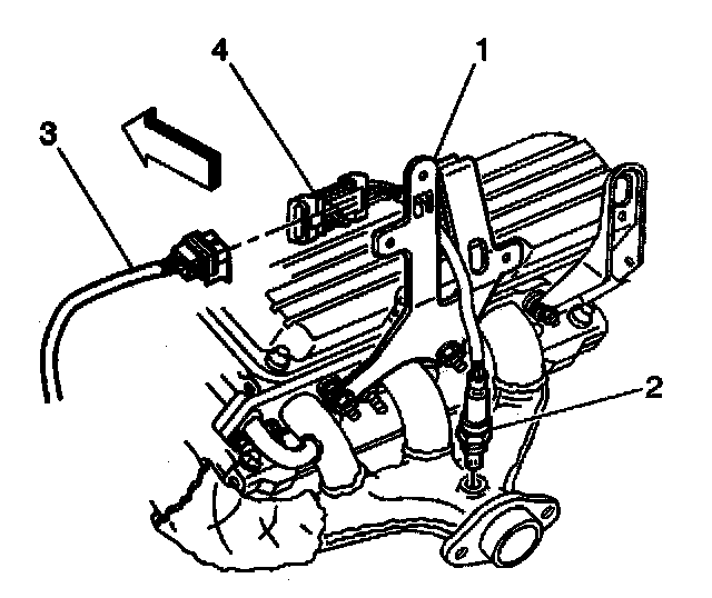 3. Connect the HO2S electrical connector tab (4) to the bracket (1).