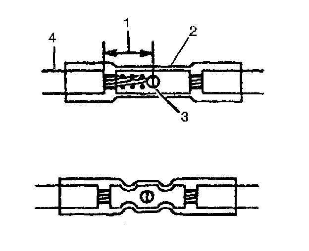 9. Insert the wires into the splice sleeve until the wire hits the barrel stop. The splice sleeve has a stop in the middle of the barrel in order to prevent the wire from passing through the splice (3).
