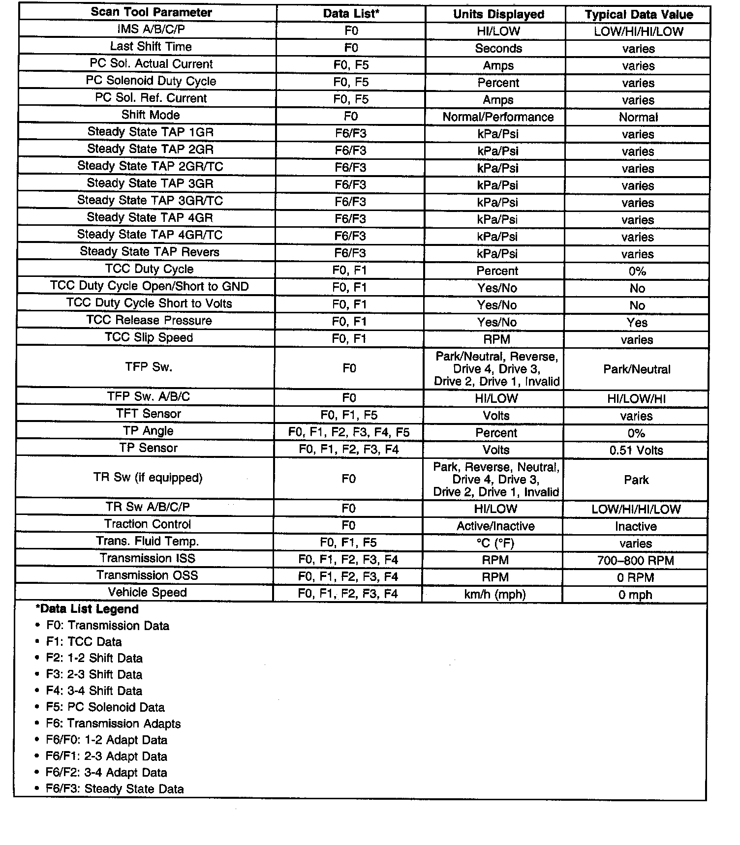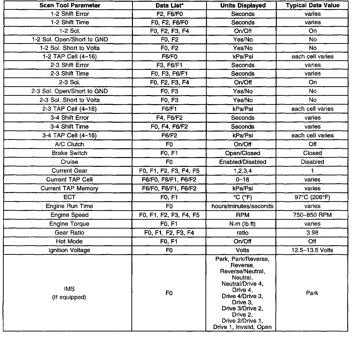 Only the parameters listed below are used in for diagnosing. If a scan tool displays other parameters, the values are not recommended by General Motors for use in diagnosis. Scan tool values below were recorded under the following conditions: