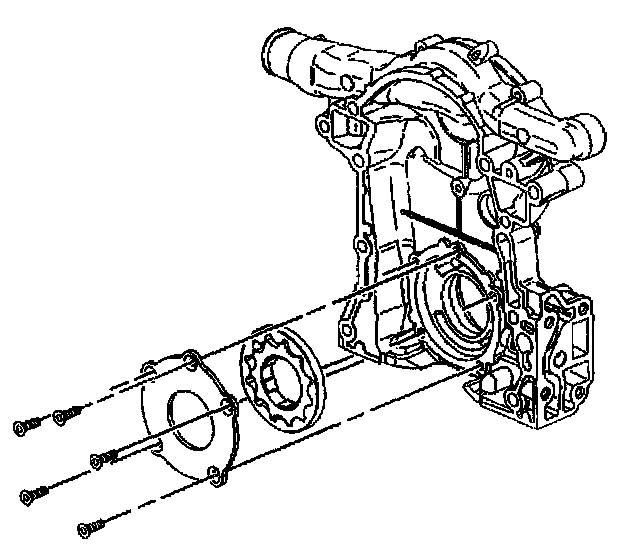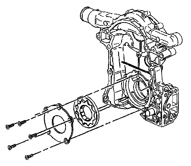 19. If replacing the engine front cover, remove the oil pump cover and gear set from the engine front cover. Refer to Oil Pump Cover and Gear Set Replacement.