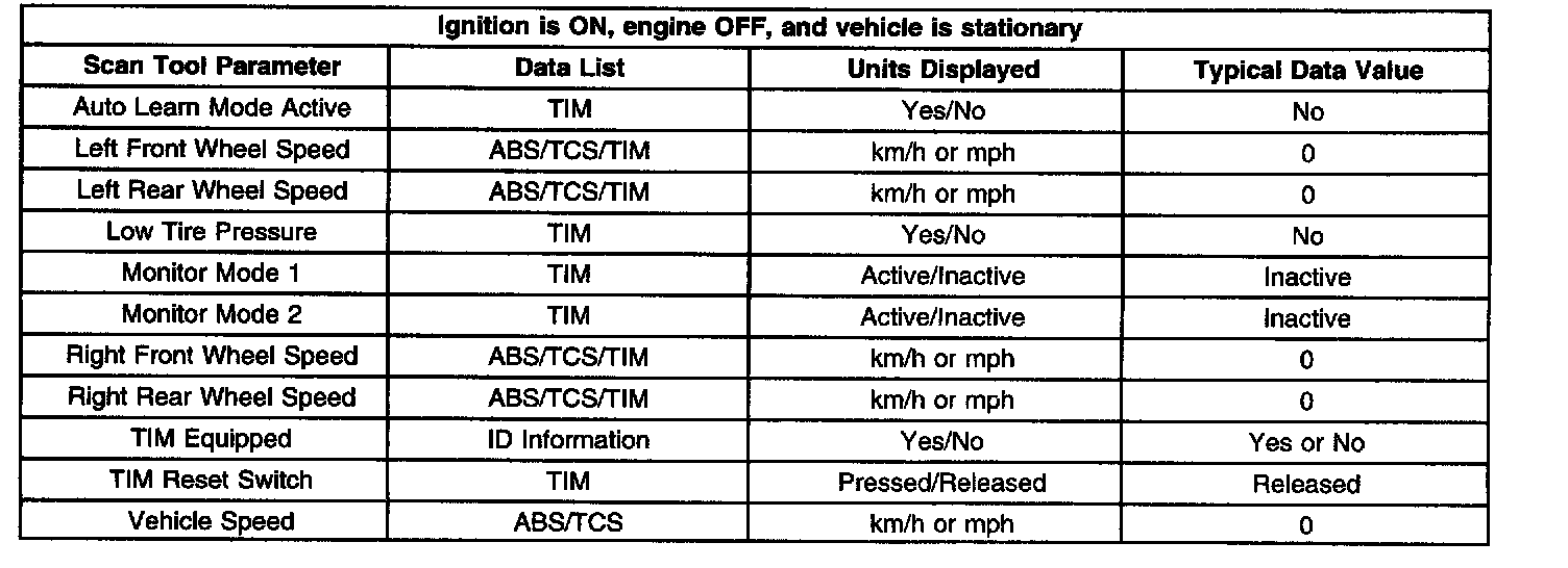 The TIM Scan Tool Data List contains all the tire inflation monitoring system related parameters that are available on the scan tool. The parameters in the list are arranged in alphabetical order. The column, 'Data List,' indicates the location of the parameter within the scan tool menu selections. Use the TIM Scan Tool Data List as directed by a diagnostic table or in order to supplement the diagnostic procedures. Begin all the diagnostic procedures with the TIM Diagnostic Starting Point. Use the TIM Scan Tool Data List only after the following is determined:^ There is no published DTC procedure nor published symptom procedure for the customer concern. OR