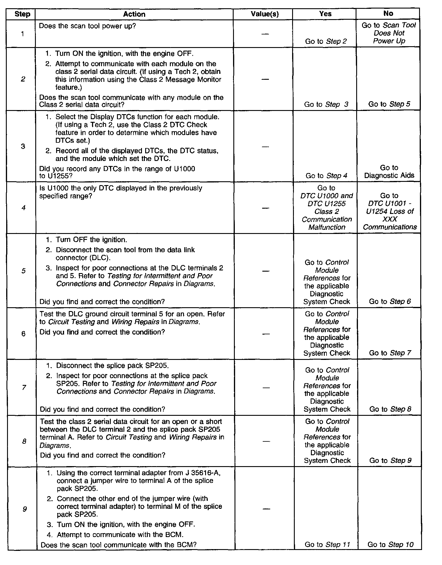 8. An open in the class 2 serial data circuit between the DLC and splice pack SP205 will prevent the scan tool from communicating with and module. This condition will not set a DTC.