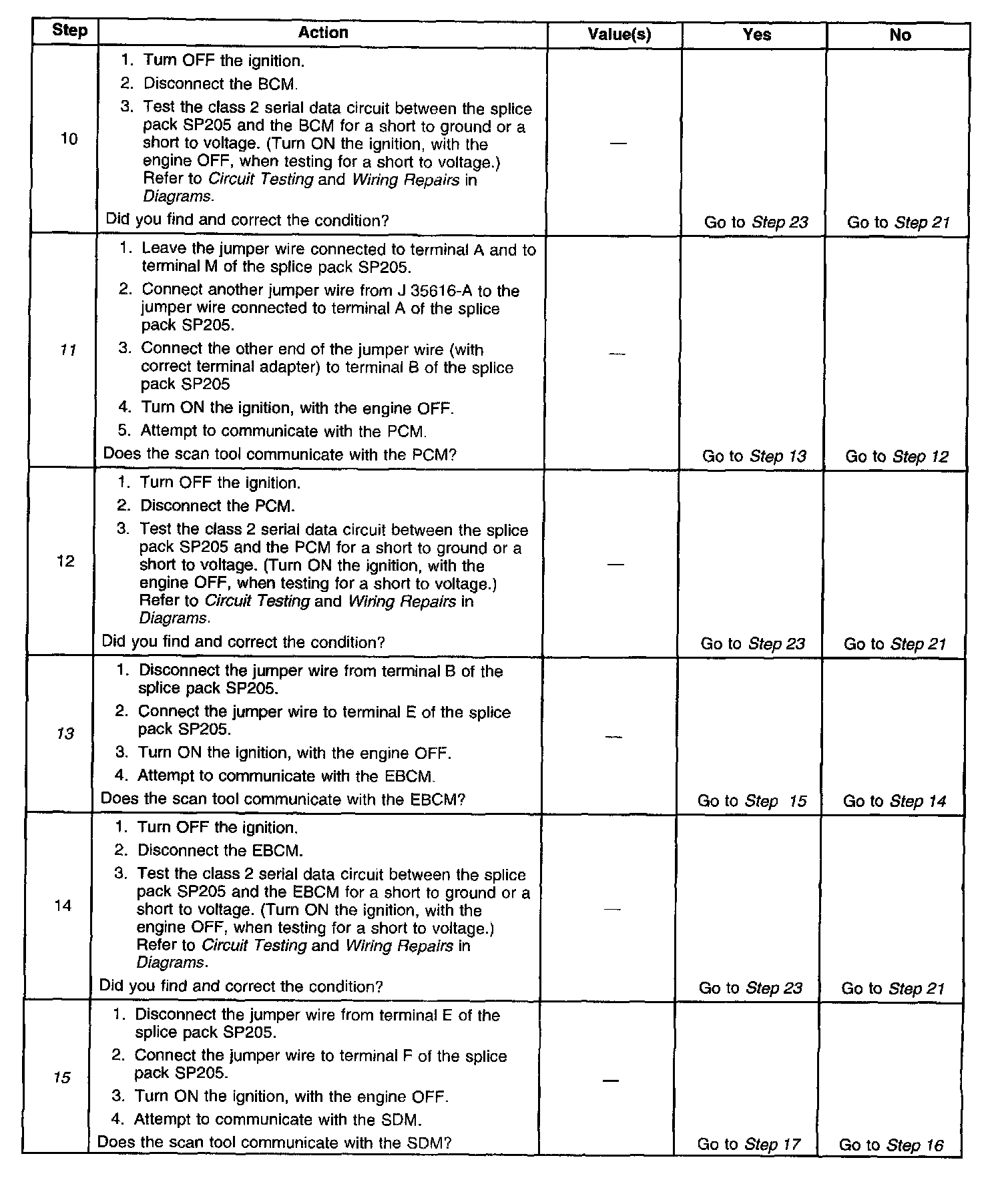 9. The class 2 serial data circuit is shorted to voltage or ground. The condition may be due to the wiring or due to a malfunction in one of the modules. When testing the wire for a short, ensure that there is not a module connected to the wire being tested. This test isolates the BCM class 2 serial data circuit.