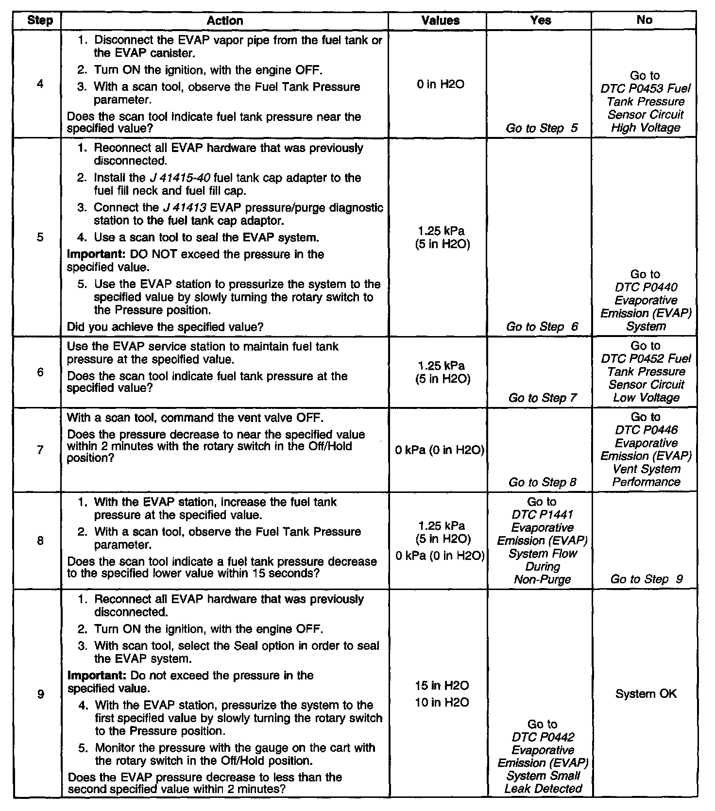 A stuck closed EVAP canister purge valve, stuck open EVAP vent valve, disconnected or damaged [1][2]EVAP purge line or vent hose, leaking fuel cap, or fill neck should set a DTC P0440. A small leak in the EVAP system should set a DTC P0442. An EVAP vent valve stuck closed, a restricted vent hose, or a blocked EVAP canister should set a DTC P0446. A continuous purge condition with no purge commanded by the PCM, EVAP purge valve stuck open or leaking, should set a DTC P1441. Refer to the DTC tables for further diagnostic procedures regarding the EVAP system.