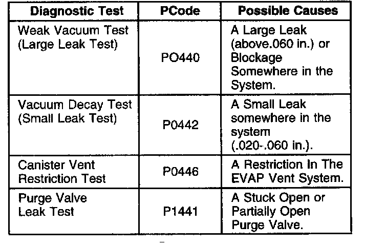 WEAK VACUUM TEST: This tests for large leaks and blockages in the EVAP system. The FTP sensor detects low fuel tank pressure resulting from a large vacuum leak or a restriction in the vacuum supply to the fuel tank. The FTP sensor value should increase over a period of time. If the PCM does not detect in increase, a malfunction is indicated by setting DTC P0440.