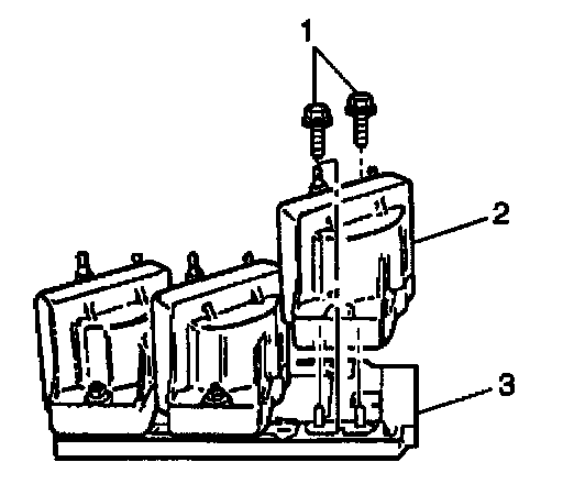 3. Remove 2 screws (1) securing the coil (2) to the ignition control module (3).