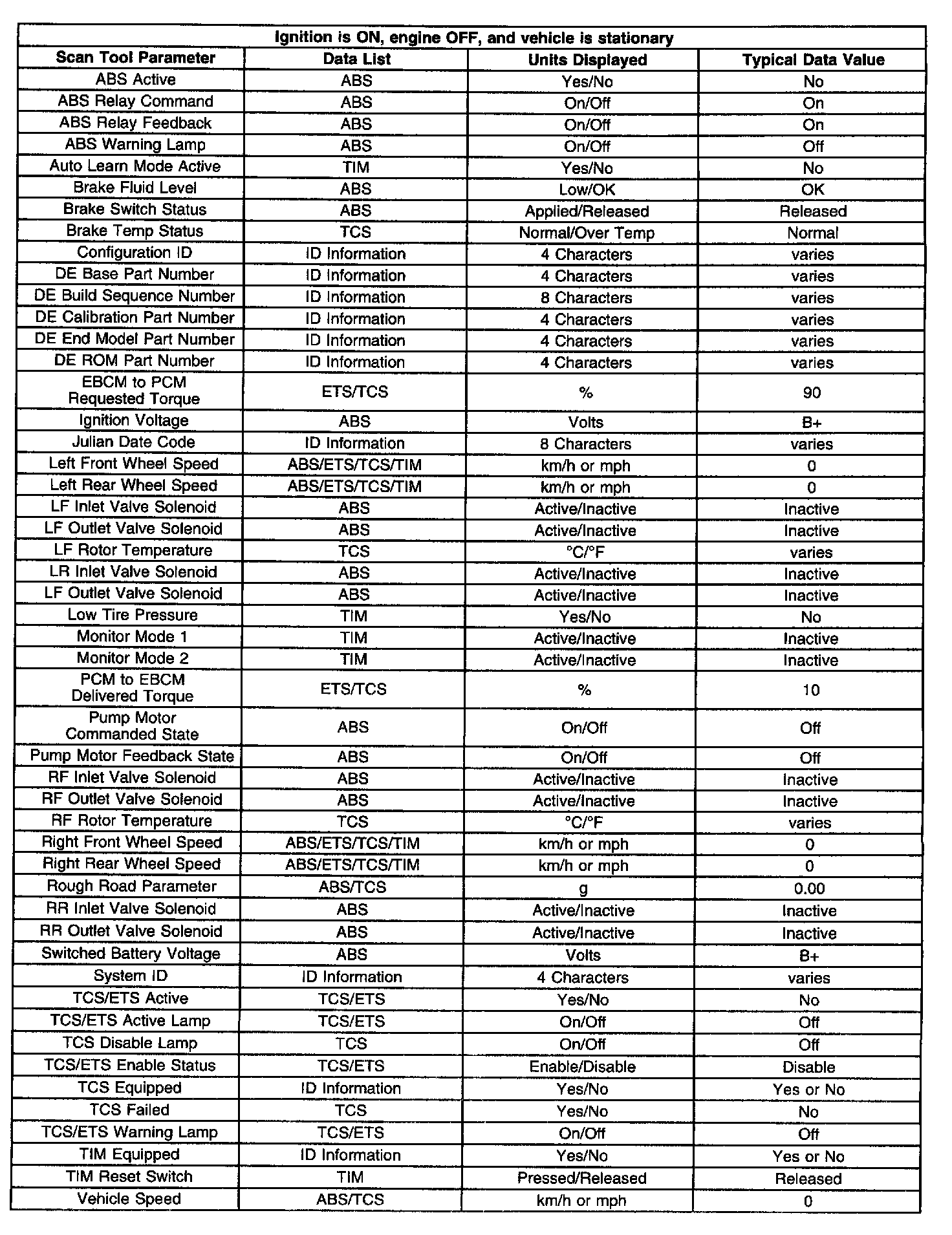 Use the BCM and the EBCM Scan Tool Data Lists as directed by a diagnostic table or in order to supplement the diagnostic procedures. Begin all the diagnostic procedures with the ABS Diagnostic Starting Point. Use the BCM and the EBCM Scan Tool Data Lists only after the following is determined: