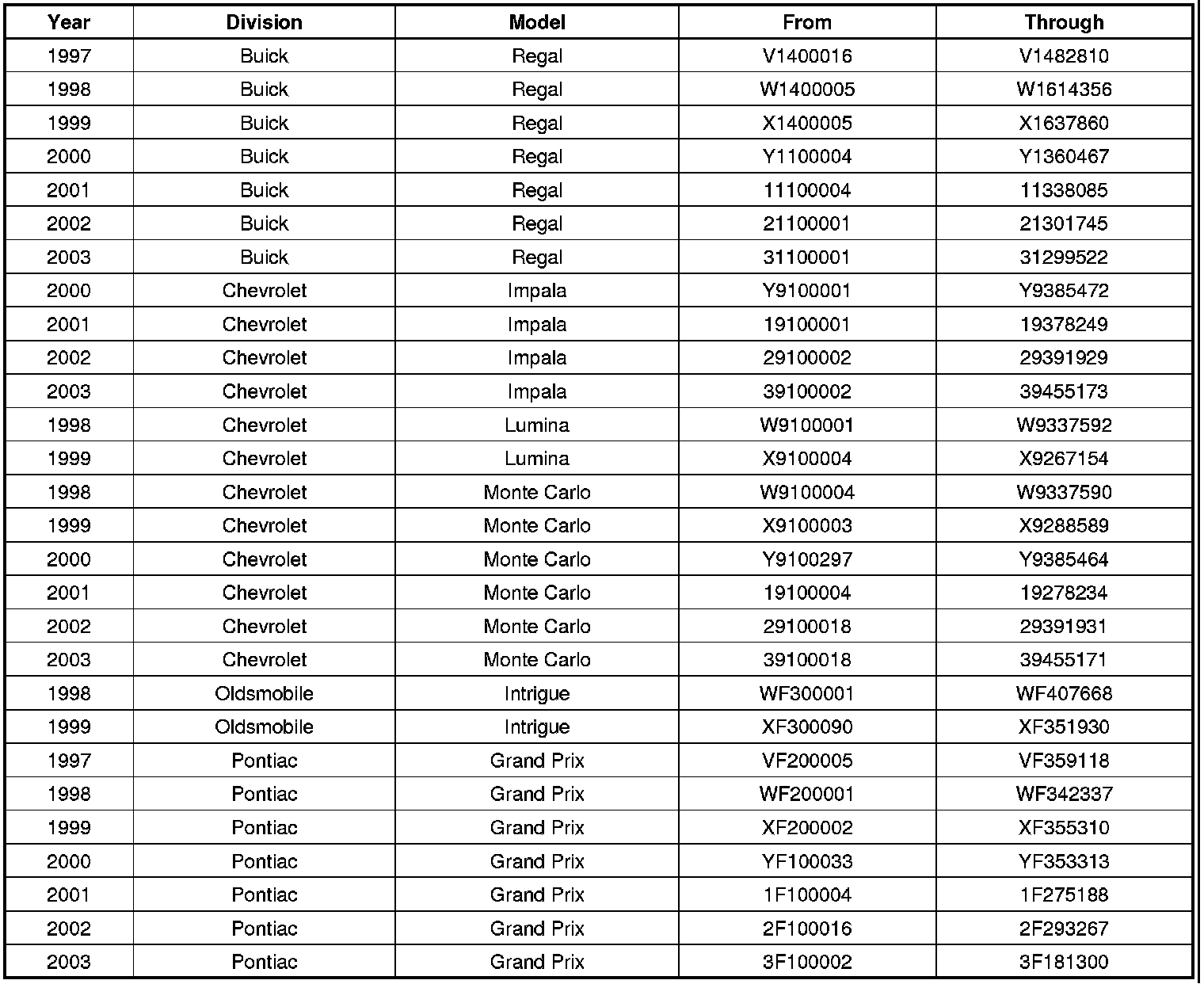 Involved are certain 1997-2003 model year Buick Regal and Pontiac Grand Prix, 1998-1999 model year Chevrolet Lumina and Oldsmobile Intrigue, 1998-2003 model year Chevrolet Monte Carlo, and 2000-2003 model year Chevrolet Impala model vehicles, equipped with a 3.8L V6 naturally aspirated engine (RPO L36 - VIN K), and built within these VIN breakpoints: